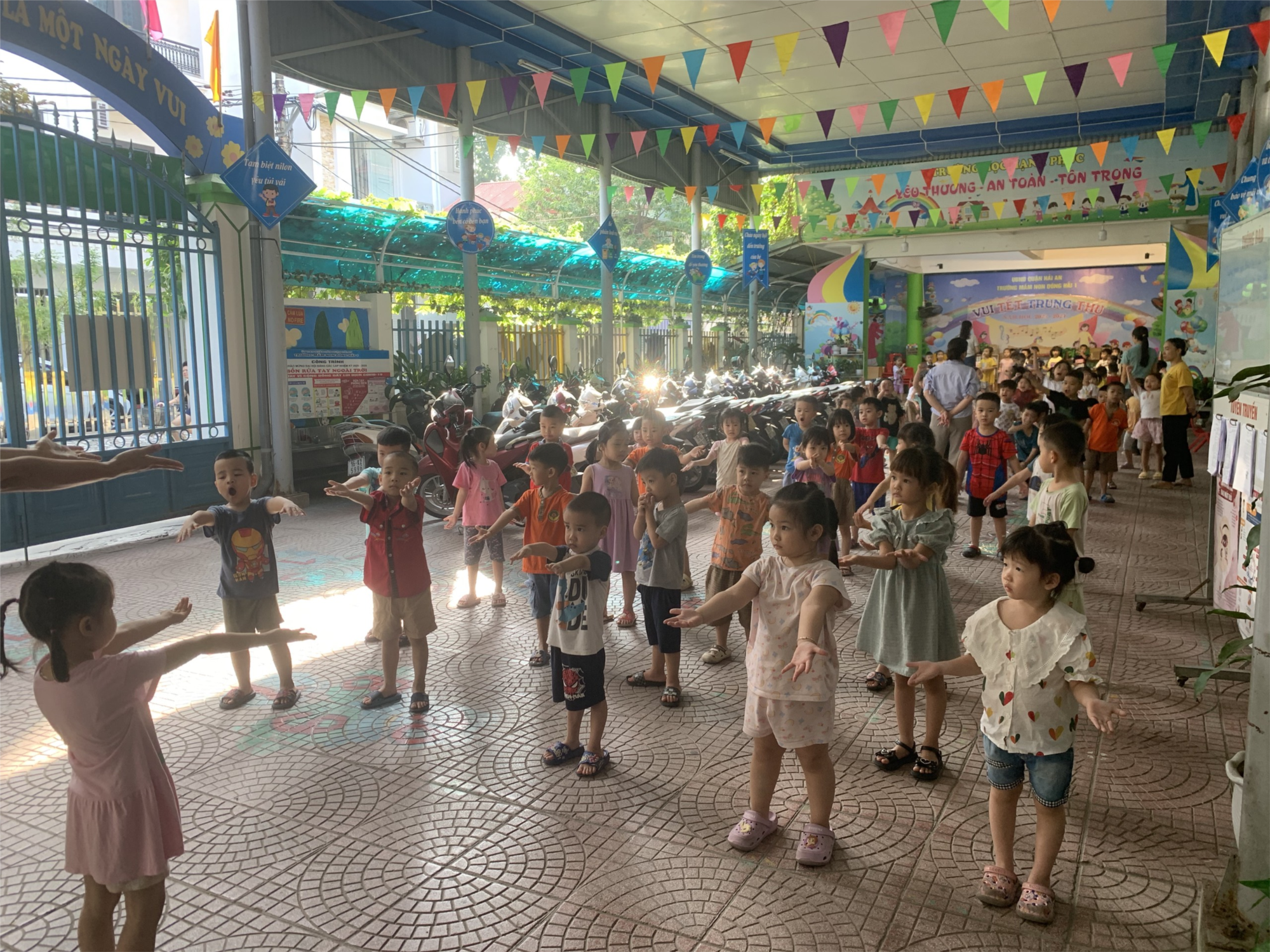 Tại Trường Mầm non Đông Hải 1, mỗi buổi sáng đều bắt đầu bằng tiếng nhạc vui nhộn vang lên trong sân trường, cùng những bước nhảy, động tác khỏe khoắn và tiếng cười rộn ràng của các bé. Đó chính là giờ tập thể dục buổi sáng – hoạt động không thể thiếu trong đời sống sinh hoạt hàng ngày của các bé mầm non.