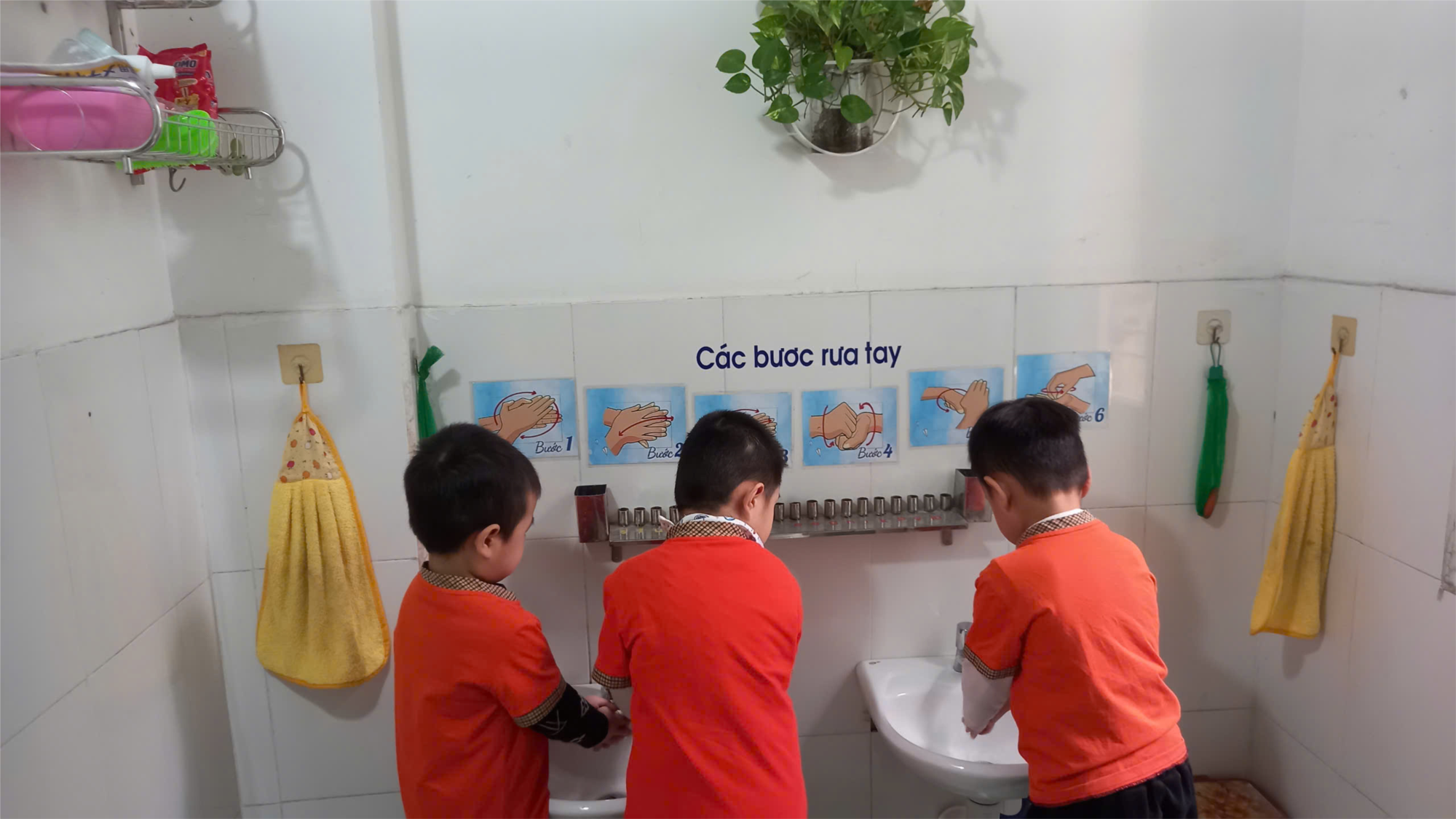 Điều đáng khen ngợi là không chỉ rửa tay sạch sẽ, các em còn rất có ý thức trong việc giữ gìn vệ sinh chung. Sau khi rửa tay, các em đều bỏ khăn đúng nơi quy định, không vứt bừa bãi. Khu vực rửa tay luôn được giữ gìn sạch sẽ, không có tình trạng nước văng tung tóe hay xà phòng vương vãi.