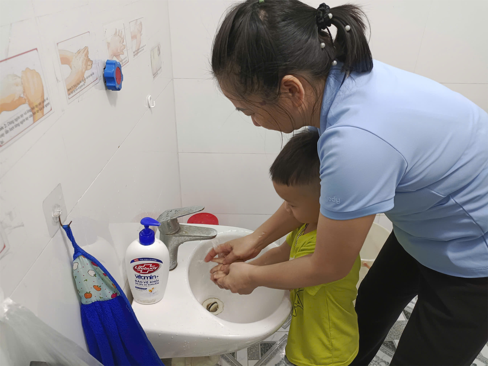 +Bước 1: Rửa từng tay cho trẻ, đầu tiên làm ướt tay, xoa xà bông, tạo bọt.