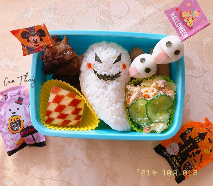 Chị Thúy tiết lộ chị có sở thích rất lạ, sở thích trang trí nhà cửa thậm chí làm cơm bento theo mùa. Những ngày gần đến lễ hội hóa trang Halloween, bà mẹ đảm đã biến tấu một chút để làm ra nhiều hộp cơm vô cùng đặc biệt, hấp dẫn cho con.