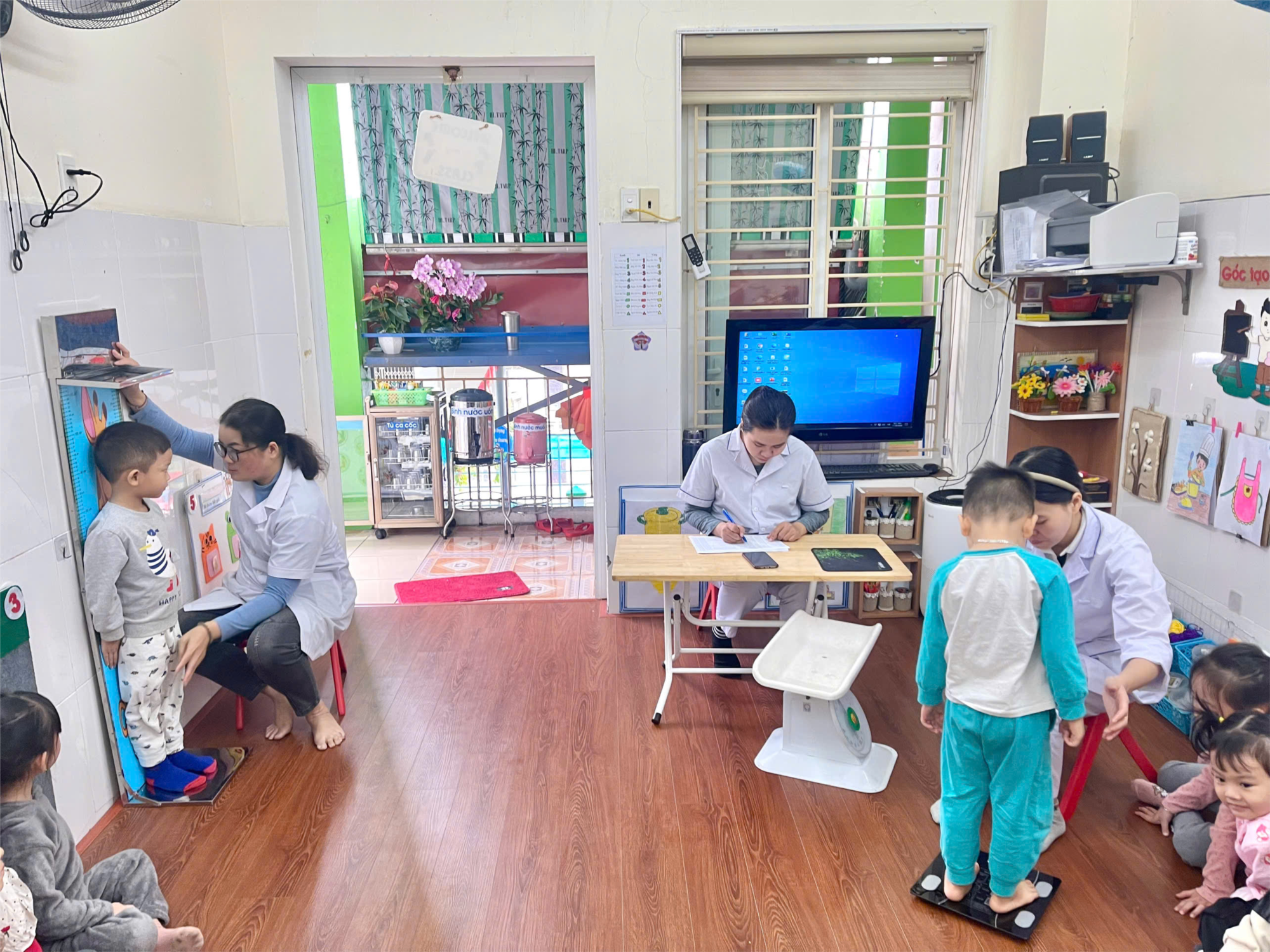 Cân đo cho trẻ là việc làm hết sức thiết thực và ý nghĩa thông qua việc cân đo định kỳ cho trẻ đã góp phần không nhỏ vào việc nâng cao nhận thức cho phụ huynh về ý thức phòng chống một số bệnh thường gặp ở lứa tuổi mầm non và cũng qua hoạt động này đã đem lại sự phấn khởi, tin tưởng trong các bậc phụ huynh về một môi trường giáo dục an toàn và thân thiện. Sau một thời gian làm việc nhiệt tình và trách nhiệm cao, 100% trẻ đã được cân đo định kỳ.