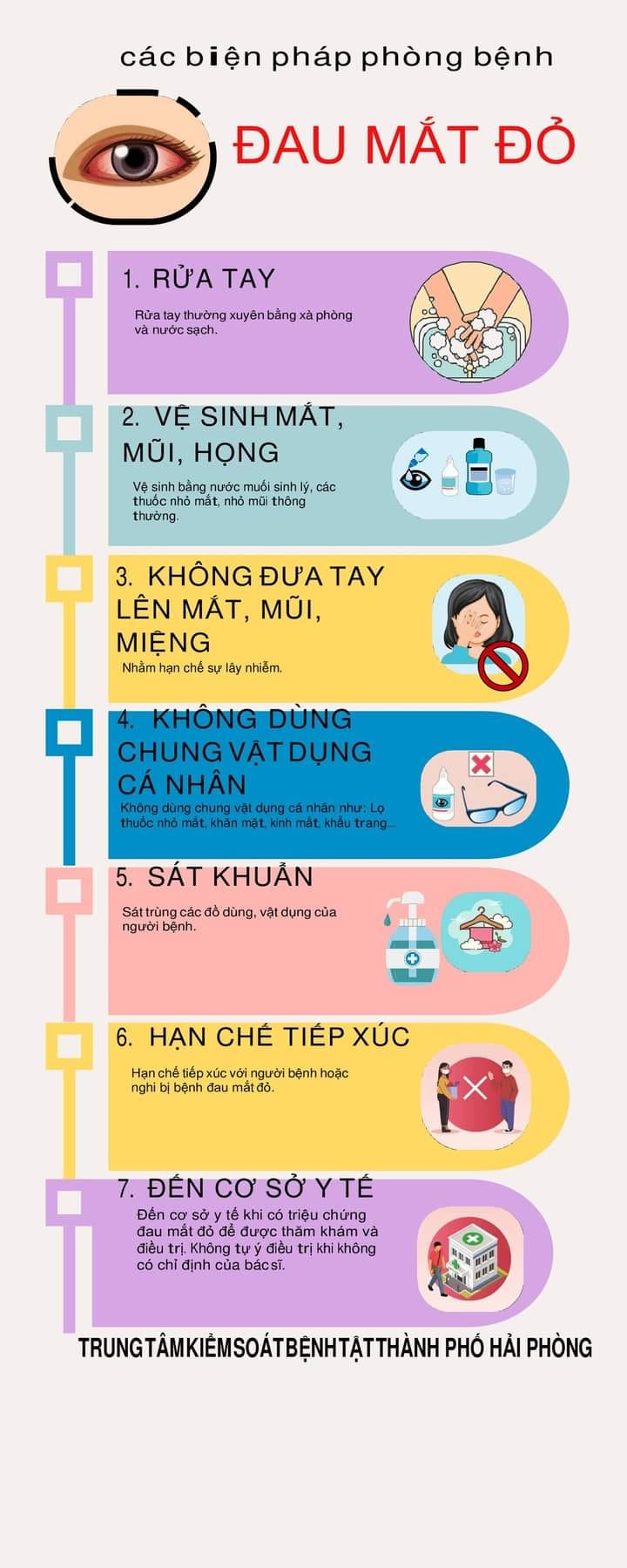 5. Người bệnh, người nghi bị bệnh đau mắt đỏ cần hạn chế tiếp xúc với người khác; cần được nghỉ học/nghỉ làm việc để tránh lây nhiễm cho người xung quanh và lây lan ra cộng đồng; đến cơ sở y tế để được khám, tư vấn, điều trị kịp thời, không tự ý điều trị khi chưa có hướng dẫn của cán bộ y tế để tránh biến chứng nặng.