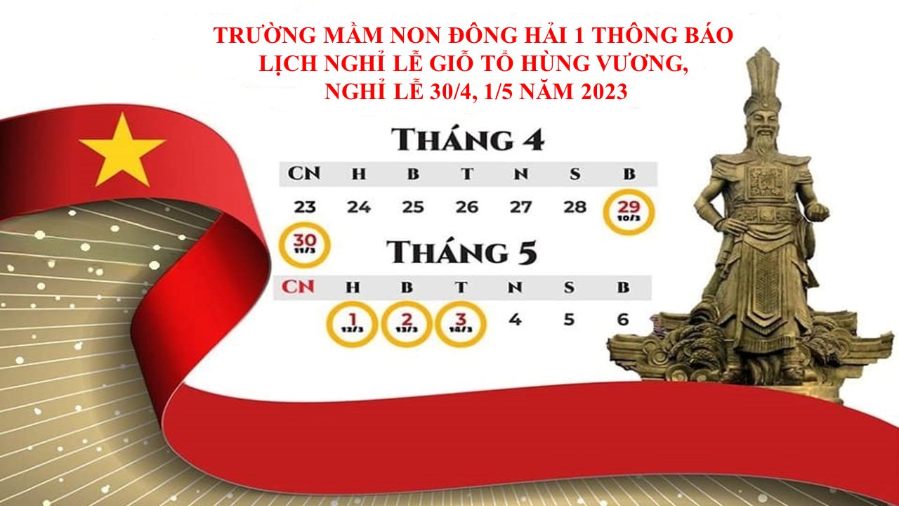 Trường mầm non Đông Hải 1 trân trọng thông báo tới Quý Phụ huynh lịch nghỉ lễ ngày Giỗ tổ Hùng Vương, Ngày giải phóng Miền Nam thống nhất đất nước và ngày Quốc tế lao động năm 2023.