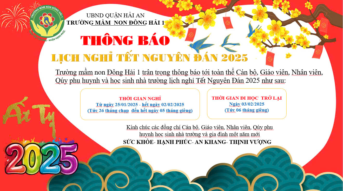 Trường MN Đông Hải 1 trân trọng thông báo lịch nghỉ Tết Nguyên Đán Ất Tỵ như sau: