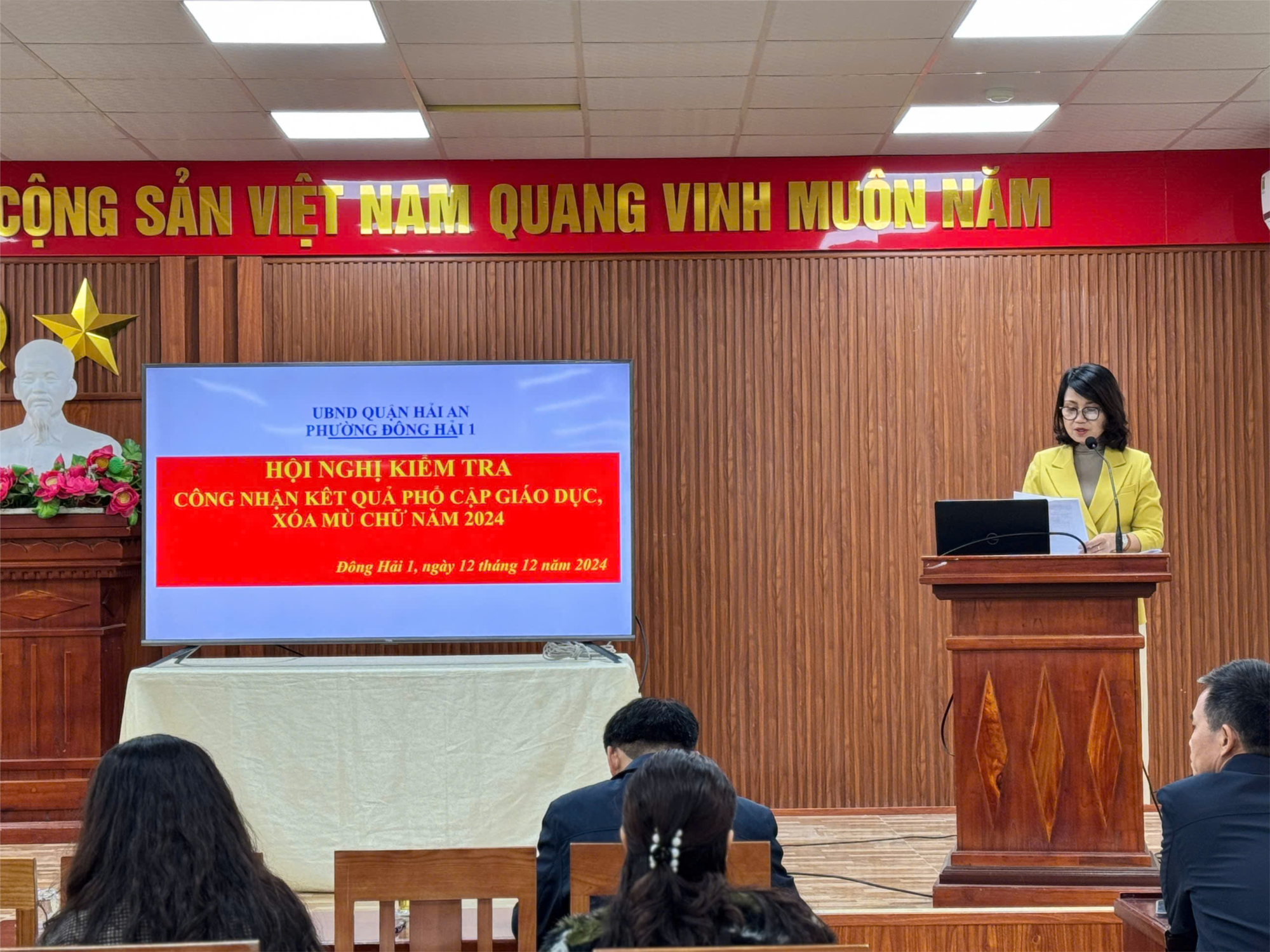 Thực hiện Quyết định số 2904 QĐ/UNBD quận Hải An, sáng ngày 12/12/2024 PGD&ĐT quận Hải An đã thành lập đoàn kiểm tra Phổ cập giáo dục, xóa mù chữ và hoạt động của các trung tâm học tập cộng đồng năm 2024 phường Đông Hải 1 tại trường THCS Đông Hải. Nhằm nâng cao mặt bằng dân trí, củng cố, nâng cao chất lượng kết quả phổ cập giáo dục mầm non cho trẻ năm tuổi, phổ cập giáo dục tiểu học và phổ cập giáo dục trung học cơ sở, xóa mù chữ (PCGD, XMC).