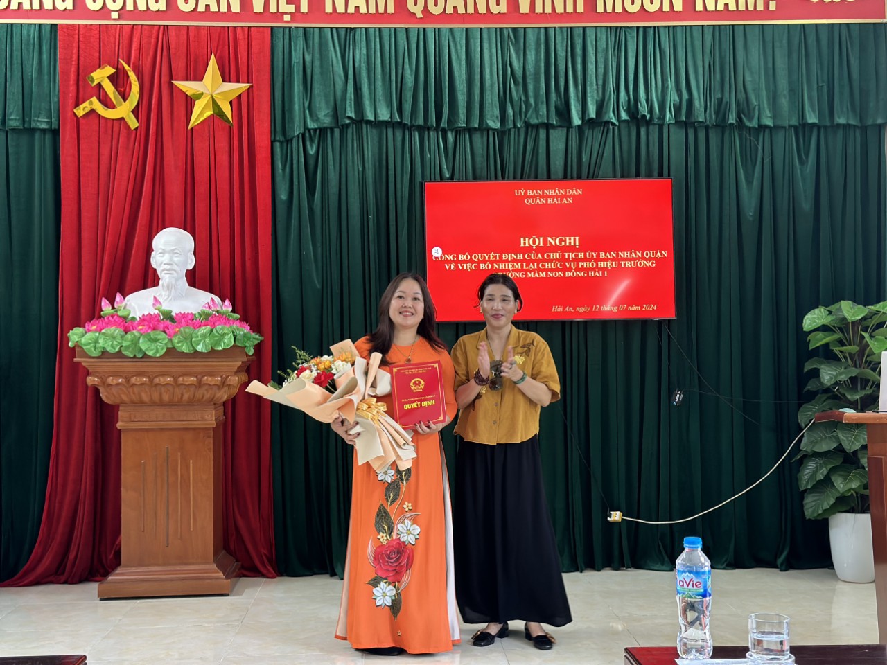 Tại hội nghị , đồng chí Trần Thị Kim Oanh - Phó Chủ tịch Uỷ ban nhân dân quận đã trao quyết định bổ nhiệm Phó Hiệu trưởng trường mầm non Đông Hải 1 cho đồng chí Phạm Thị Nga kể từ ngày 04/6/2024. Trần Thị Kim Oanh đề nghị đồng chí Phạm Thị Nga tiếp tục phát huy khả năng, vai trò lãnh đạo trong công tác giáo dục, đào tạo của trường . Mong đội ngũ cán bộ giáo viên , nhân viên nhà trường phát huy truyền thống đoàn kết của địa phương Đông Hải 1, chung sức chung lòng cùng tập thể cán bộ hoàn thành xuất sắc nhiệm vụ các năm học tiếp theo, góp phần đưa giáo dục Hải An ngày càng phát triển.