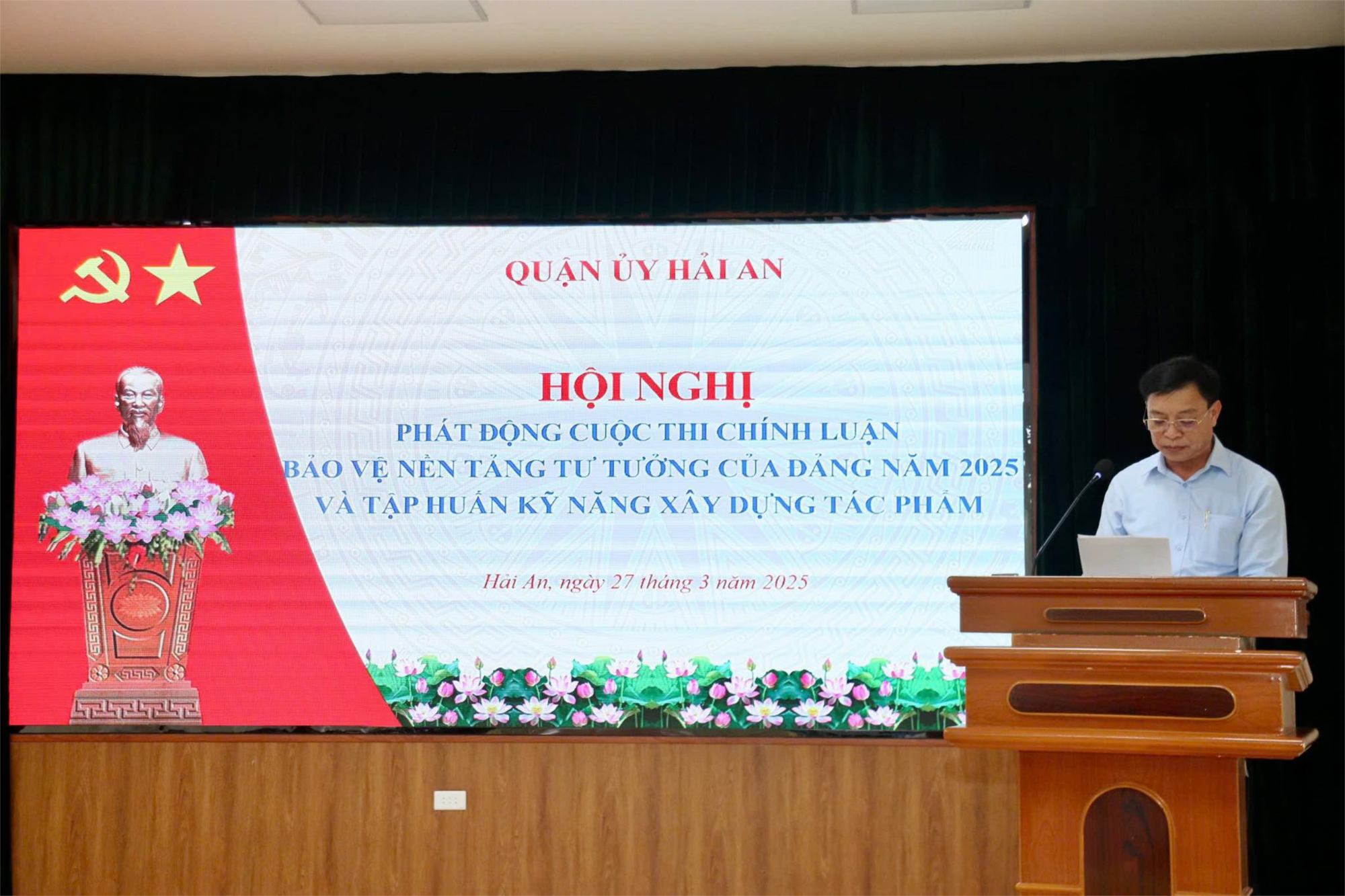 Chiều 27/3, Quận uỷ Hải An tổ chức Hội nghị phát động cuộc thi chính luận về “Bảo vệ nền tảng tư tưởng của Đảng năm 2025” và tập huấn kỹ năng xây dựng tác phẩm chính luận. Tới dự có đồng chí: Tiến sỹ Nguyễn Kim Pha – Bí thư Đảng ủy, Hiệu Trưởng trường Chính trị Tô Hiệu; Nguyễn Văn Hiểu – Phó Trưởng ban Ban Tuyên giáo và Dân vận Thành ủy; Hoàng Hải Bằng – Phó Bí thư